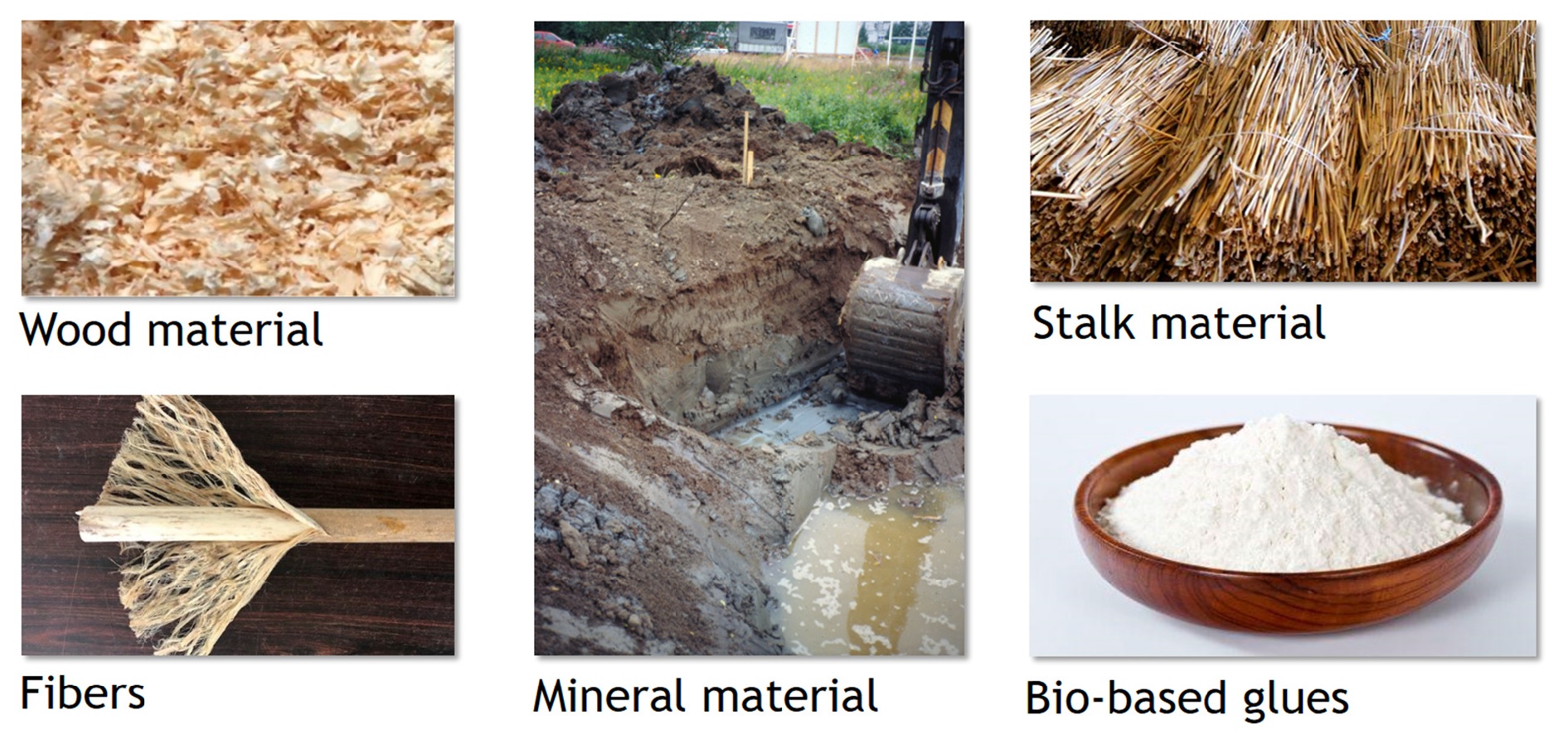 The construction sector globally produces around 35% of greenhouse gas emissions and up to 30% of waste. In accordance with the UN climate conference, the world should break away from the use of fossil fuels, in which case building materials should also be able to be produced fossil-free. This need is well met by Nature-Based building products, the production of which does not require high temperatures. The building products in question consist of renewable raw materials obtained from the surface layer of the earth and are easily returned to nature (picture below). These raw materials have been used in construction without problems for thousands of years, and today they are obtained from agriculture, forestry and ground digging.