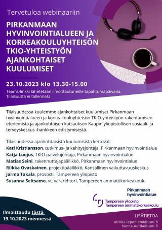 Pirkanmaan hyvinvointialueen ja korkeakouluyhteisön TKIO-yhteistyön ajankohtaiset kuulumiset -kevään webinaari järjestetään 9.4.2023: linkki